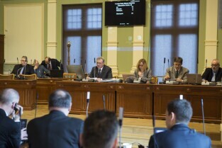 Sesja Rady Miasta Gdańska w Nowym Ratuszu. Nz. Prezydium Rady, od lewej: Przewodniczący Bogdan Oleszek, Agnieszka Owczarczak, Wojciech Błaszkowski, Piotr Czauderna
