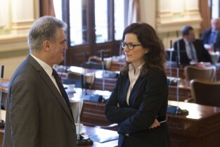 Sesja Rady Miasta Gdańska w Nowym Ratuszu. Nz. Przewodniczący Rady Miasta Gdańska Bogdan Oleszek i radna Aleksandra Dulkiewicz