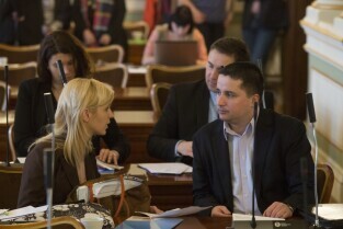 Sesja Rady Miasta Gdańska w Nowym Ratuszu. Nz. radni Emilia Lodzińska i Przemysław Ryś