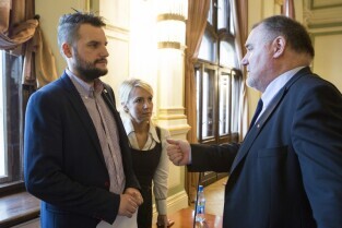 Sesja Rady Miasta Gdańska w Nowym Ratuszu. Nz. radni, od lewej: Łukasz Hamadyk, Dorota Dudek i Piotr Gierszewski