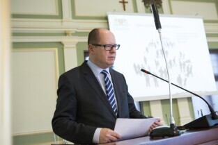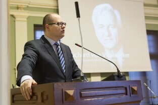 Sesja Rady Miasta Gdańska w Nowym Ratuszu. Upamiętnienie zmarłych w ostatnim czasie Richarda von Weizsaeckera i Jerzego Sampa. Nz. Przewodniczący Rady Miasta Gdańska Bogdan Oleszek
