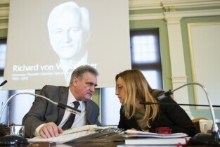 Sesja Rady Miasta Gdańska w Nowym Ratuszu. Upamiętnienie zmarłych w ostatnim czasie Richarda von Weizsaeckera i Jerzego Sampa. Nz. Przewodniczący Rady Miasta Gdańska Bogdan Oleszek i Wiceprzewodnicząca Agnieszka Owczarczak
