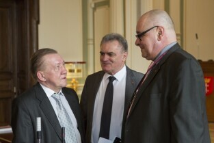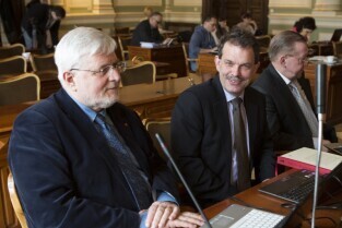 Sesja Rady Miasta Gdańska w Nowym Ratuszu. Nz. od lewej radni: Jaromir Falandysz, Piotr Gierszewski, Kazimierz Koralewski
