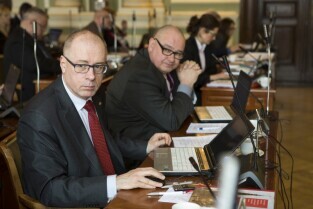 Sesja Rady Miasta Gdańska w Nowym Ratuszu. Nz. radny Piotr Dzik, przewodniczący Bogdan Oleszek, radny Grzegorz Strzelczyk