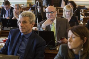Sesja Rady Miasta Gdańska w Nowym Ratuszu. Nz. w pierwszym rzędzie od lewej radni: Jaromir Falandysz, Piotr Gierszewski, Kazimierz Koralewski, Grzegorz Strzelczyk