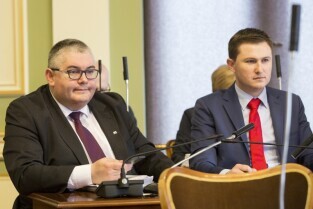 Gdańsk, Nowy Ratusz. Sesja Rady Miasta Gdańska. Nz. radni Grzegorz Strzelczyk i Piotr Dzik (po prawej)