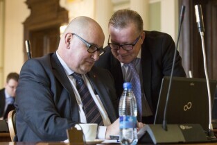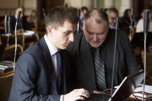 Gdańsk, Nowy Ratusz. Sesja Rady Miasta Gdańska. Nz. radni Jaromir Falandysz i Piotr Gierszewski