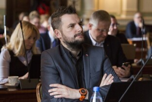 Gdańsk, Nowy Ratusz. Sesja Rady Miasta Gdańska. Nz. radny Przemysław Ryś