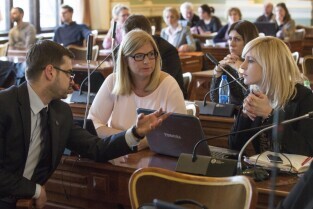 Gdańsk, Nowy Ratusz. Sesja Rady Miasta Gdańska. Nz. od lewej radni: Aleksandra Dulkiewicz, Wojciech Stybor, Andrzej Kowalczys