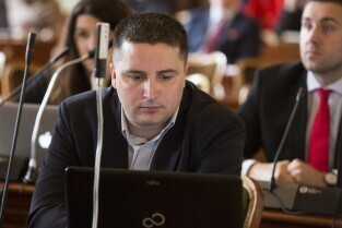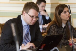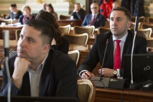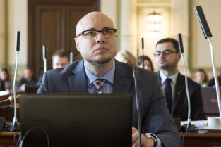 Gdańsk, Nowy Ratusz. Sesja Rady Miasta Gdańska. Nz. radny Łukasz Hamadyk