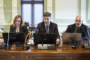 Gdańsk, Nowy Ratusz. Sesja Rady Miasta Gdańska. Nz. Prezydium Rady, od lewej: Agnieszka Owczarczak, Wojciech Błaszkowski, Piotr Czauderna
