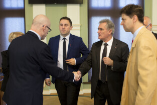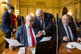 Gdańsk, Nowy Ratusz. XLIV Sesja Rady Miasta Gdańska. Nz. od lewej radni Kazimierz Koralewski, Piotr Borawski, przewodniczący rady Bogdan Oleszek, Wojciech Błaszkowski