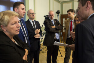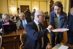 Gdańsk, Nowy Ratusz. XLIV Sesja Rady Miasta Gdańska. Nz. od lewej: sekretarz miasta Danuta Janczarek; radni Piotr Borawski, Kazimierz Koralewski, Piotr Czauderna, Wojciech Błaszkowski