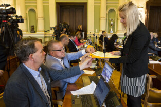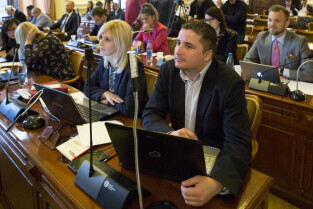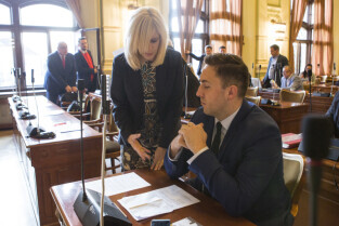 Gdańsk, Nowy Ratusz. XLIV Sesja Rady Miasta Gdańska. Nz. radni Magdalena Olek i Mateusz Skarbek
