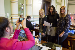 Gdańsk, Nowy Ratusz. XLIV Sesja Rady Miasta Gdańska. Nz. radne Emilia Lodzińska, Żaneta Geryk, Beata Wierzba; zdjęcie wykonuje radna Beata Jankowiak