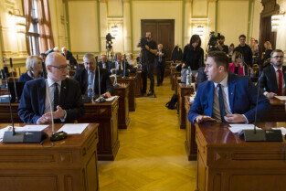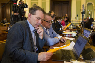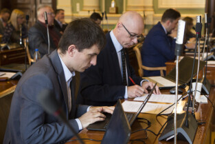Gdańsk, Nowy Ratusz. XLIV Sesja Rady Miasta Gdańska. Nz. od lewej radni Grzegorz Strzelczyk, Kazimierz Koralewski, Piotr Gierszewski