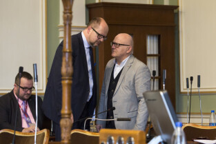 Gdańsk, Nowy Ratusz. XLIV Sesja Rady Miasta Gdańska. Nz. radni Jarosław Gorecki i Piotr Dzik