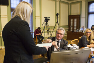 Gdańsk, Nowy Ratusz. XLIV Sesja Rady Miasta Gdańska. Losowanie listu-informacji o podopiecznym MOPR w ramach akcji "Każdy może pomóc". Nz. autorka projektu Magdalena Theus