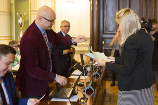Gdańsk, Nowy Ratusz. XLIV Sesja Rady Miasta Gdańska. Losowanie listu-informacji o podopiecznym MOPR w ramach akcji "Każdy może pomóc". Nz. radny Łukasz Hamadyk