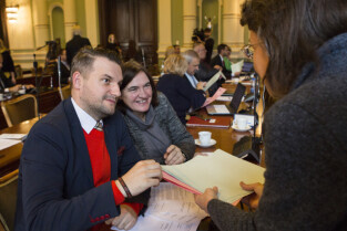 Gdańsk, Nowy Ratusz. XLIV Sesja Rady Miasta Gdańska. Losowanie listu-informacji o podopiecznym MOPR w ramach akcji "Każdy może pomóc". Nz. radni Anna Kołakowska i Łukasz Hamadyk