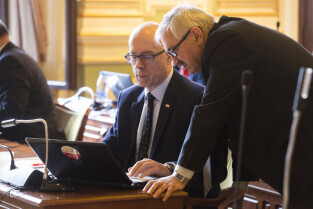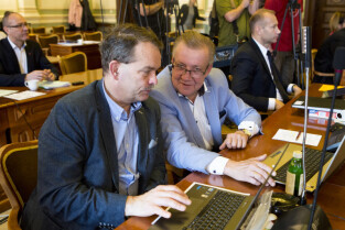Gdańsk, Nowy Ratusz. XLIV Sesja Rady Miasta Gdańska. Nz. radni Kazimierz Koralewski i Jacek Teodorczyk