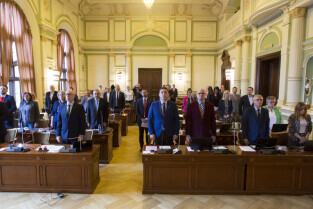 Gdańsk, Nowy Ratusz. XLIV Sesja Rady Miasta Gdańska. Nz. radni czczą pamięć zmarłego Honorowego Obywatela Miasta Gdańska ks. Stanisława Bogdanowicza