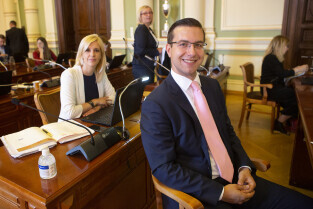 Gdańsk, Nowy Ratusz. Sesja Rady Miasta Gdańska. Nz. radni Katarzyna Czerniewska i Bogdan Oleszek