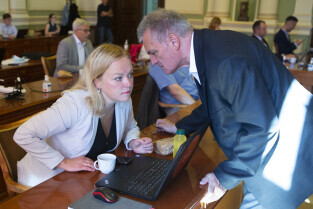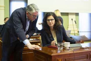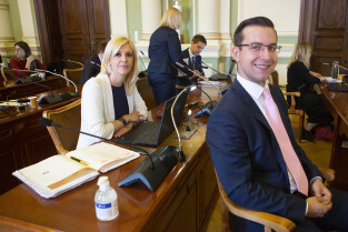 Gdańsk, Nowy Ratusz. Sesja Rady Miasta Gdańska. Nz. radna Emilia Lodzińska i radny Cezary Śpiewak-Dowbór