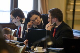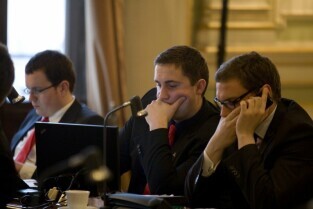 Sesja Rady Miasta Gdańska, podczas której m.in. uchwalono budżet na 2011 rok. Gdańsk, Nowy Ratusz. Nz. od prawej radni: Szymon Moś, Piotr Borawski, Dariusz Słodkowski