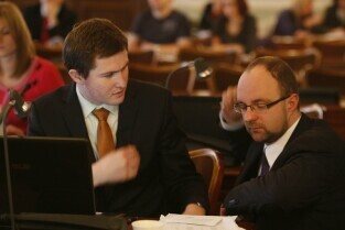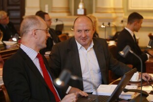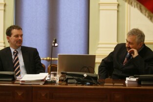 Sesja Rady Miasta Gdańska, podczas której m.in. uchwalono budżet na 2011 rok. Gdańsk, Nowy Ratusz. Nz. radni: Piotr Grzelak (po lewej) i Paweł Czerniecki