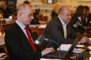 Sesja Rady Miasta Gdańska, podczas której m.in. uchwalono budżet na 2011 rok. Gdańsk, Nowy Ratusz. Nz. radni Piotr Dzik (po lewej) i Marek Bumblis, tyłem Marcin Skwierawski