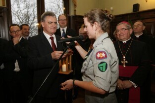 Sesja Rady Miasta Gdańska, podczas której m.in. uchwalono budżet na 2011 rok. Gdańsk, Nowy Ratusz. Nz. opłatek radnych z udziałem Metropolitą Gdańskim Abp Sławojem Leszka Głódzia, podczas którego harcerze przekazali radnym światełko Betlejemskie