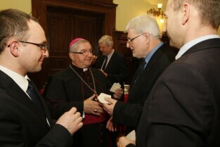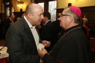 Sesja Rady Miasta Gdańska, podczas której m.in. uchwalono budżet na 2011 rok. Gdańsk, Nowy Ratusz. Nz. opłatek radnych z udziałem Metropolitą Gdańskim Abp Sławojem Leszka Głódzia