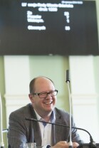 Sesja Rady Miasta Gdańska w Nowym Ratuszu. Nz. Prezydent Gdańska Paweł Adamowicz, któremu Rada Miasta Gdańska udzieliła absolutorium