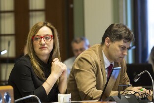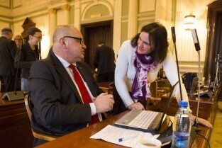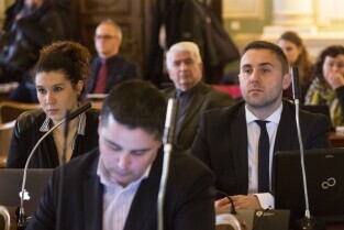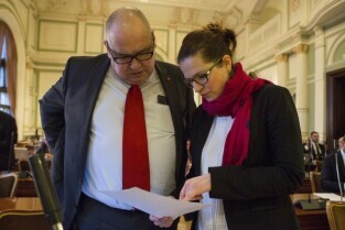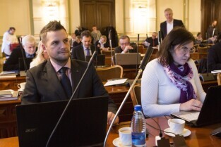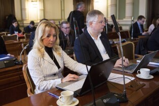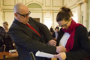 Gdańsk, Nowy Ratusz. Sesja Rady Miasta Gdańska, podczas której m.in. głosowano nad uchwałą nadającą tytuł Honorowego Obywatela Gdańska reżyserowi Andrzejowi Wajdzie. Nz. Radni Miasta Gdańska Łukasz Hamadyk i Anna Kołakowska
