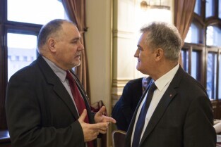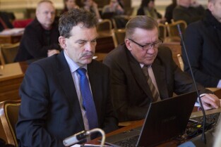 Gdańsk, Nowy Ratusz. Sesja Rady Miasta Gdańska, podczas której m.in. głosowano nad uchwałą nadającą tytuł Honorowego Obywatela Gdańska reżyserowi Andrzejowi Wajdzie. Nz. Radny Miasta Gdańska Piotr Gierszewski i Przewodniczący Rady Miasta Gdańska Bogdan Oleszek (po prawej)