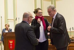 Gdańsk, Nowy Ratusz. Sesja Rady Miasta Gdańska, podczas której m.in. głosowano nad uchwałą nadającą tytuł Honorowego Obywatela Gdańska reżyserowi Andrzejowi Wajdzie. Nz. Radni Miasta Gdańska Grzegorz Strzelczyk i Aleksandra Dulkiewicz, po prawej Przewodniczący Rady Miasta Gdańska Bogdan Oleszek