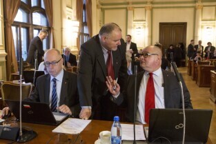 Gdańsk, Nowy Ratusz. Sesja Rady Miasta Gdańska, podczas której m.in. głosowano nad uchwałą nadającą tytuł Honorowego Obywatela Gdańska reżyserowi Andrzejowi Wajdzie. Nz. Radni Miasta Gdańska Piotr Gierszewski i Grzegorz Strzelczyk, po prawej Kazimierz Koralewski