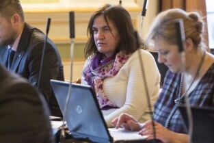Gdańsk, Nowy Ratusz. Sesja Rady Miasta Gdańska, podczas której m.in. głosowano nad uchwałą nadającą tytuł Honorowego Obywatela Gdańska reżyserowi Andrzejowi Wajdzie. Nz. Radny Miasta Gdańska Emilia Lodzińska