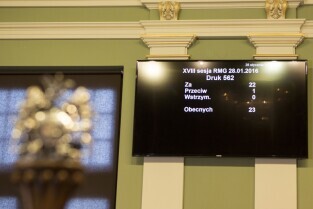 Gdańsk, Nowy Ratusz. Sesja Rady Miasta Gdańska, podczas której m.in. głosowano nad uchwałą nadającą tytuł Honorowego Obywatela Gdańska reżyserowi Andrzejowi Wajdzie. Nz. wyniki głosowania