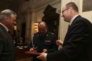 Sesja Rady Miasta Gdańska w Nowym Ratuszu. Nz. Bogdan Oleszek i Paweł Adamowicz wręczają medal przedstawicielowi Straży Pożarnej w Sobieszewie