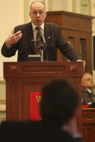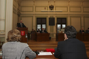Sesja Rady Miasta Gdańska w Nowym Ratuszu. Nz. przemawia Kazimierz Koralewski