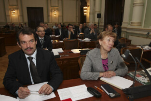 Sesja Rady Miasta Gdańska w Nowym Ratuszu. Nz. Jarosław Gorecki i Maria Małkowska