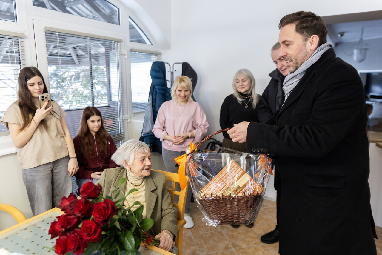 Gdańsk. Pani Olga Dedio obchodzi setne urodziny. Z życzeniami, kwiatami i prezentem stulatkę odwiedzili Piotr Borawski, zastępca prezydent Gdańska ds. mobilności i bezpieczeństwa oraz Grzegorz Graefling, zastępca kierownika Urzędu Stanu Cywilnego w Gdańsku.