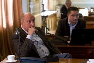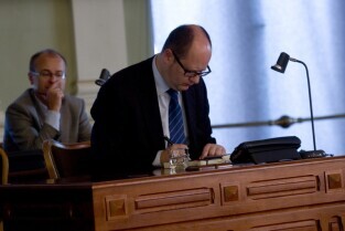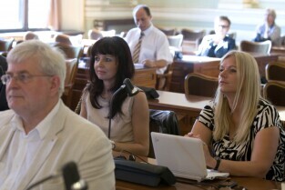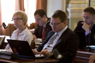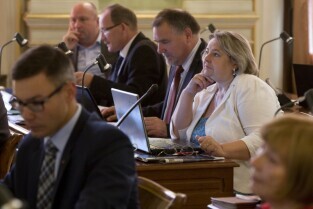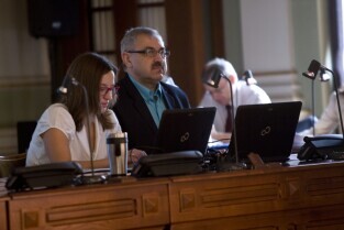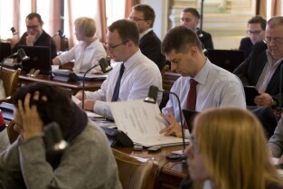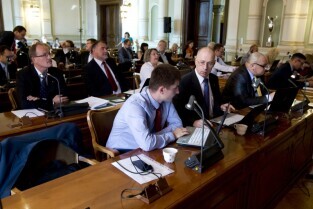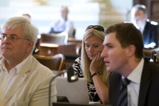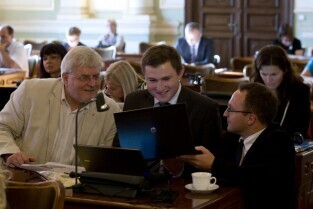 Sierpniowa sesja Rady Miasta Gdańska w Nowym Ratuszu. Nz. w pierwszym rzędzie od lewej radni: Jaromir Falandysz, Kazimierz Koralewski, Grzegorz Strzelczyk