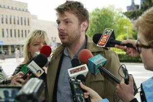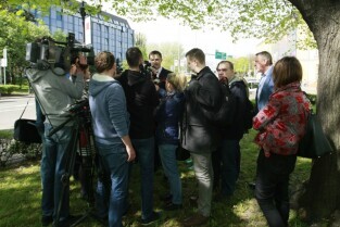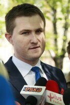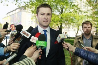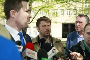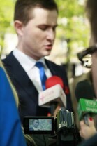 Skwer pod pomnikiem Jana II Sobieskiego w Gdańsku. Briefing prasowy poświęcony sposobom na skuteczne uporządkowanie reklam oraz nowym zasadom lokalizowania reklam w mieście. Nz. zastępca prezydenta Gdańska Piotr Grzelak.