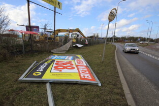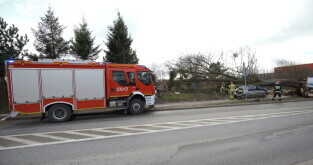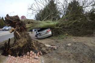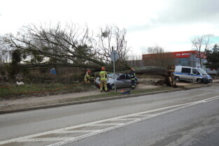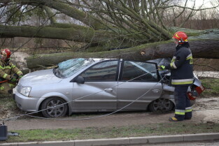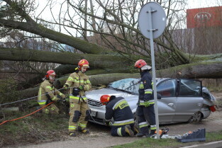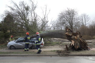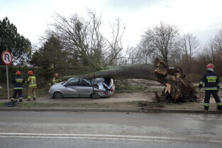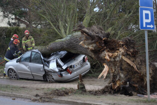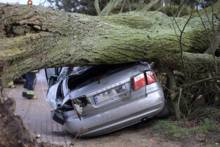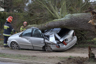 Gdańsk. Skutki Wichury w Gdańsku. Nz. Drzewo przygniotło auto na Kartuskiej.