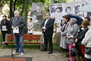 Gdańsk Strzyża. Uroczystość nadania imienia Krzysztofa Kolbergera, urodzonego w Gdańsku aktora i reżysera, skwerowi położonemu przy ulicy Karłowicza. Nz. przemawia Przewodniczący Komisji Kultury i Promocji RMG Marek Bumblis