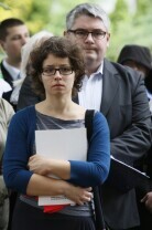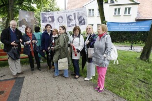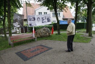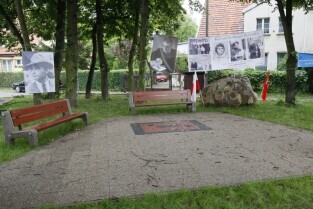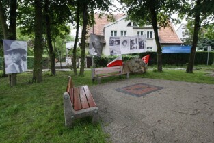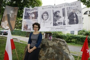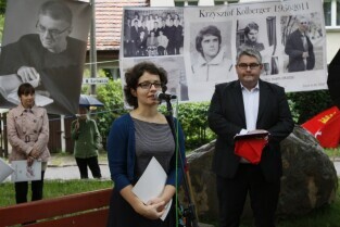 Gdańsk Strzyża. Uroczystość nadania imienia Krzysztofa Kolbergera, urodzonego w Gdańsku aktora i reżysera, skwerowi położonemu przy ulicy Karłowicza. Nz. córka patrona Julia Kolberger