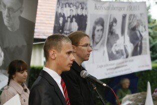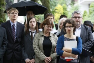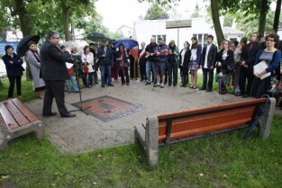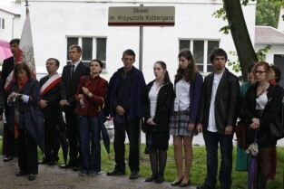 Gdańsk Strzyża. Uroczystość nadania imienia Krzysztofa Kolbergera, urodzonego w Gdańsku aktora i reżysera, skwerowi położonemu przy ulicy Karłowicza. Nz. recytacja wierszy w wykonaniu uczniów IX LO w Gdańsku, do którego uczęszczał Krzysztof Kolberger